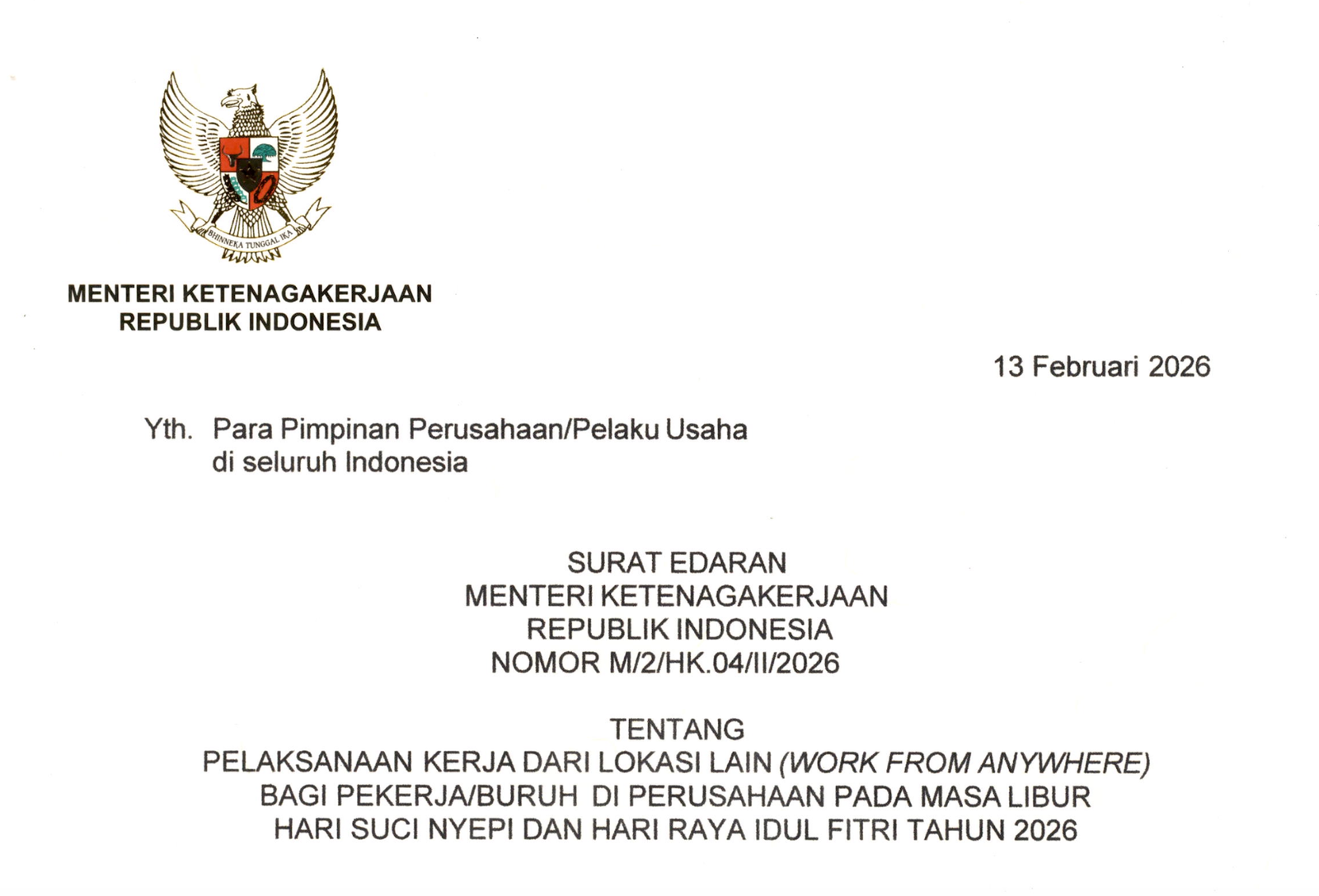 Langkah ini tertuang resmi dalam Surat Edaran (SE) Menaker Nomor M/2/HK.04/11/2026 tentang Pelaksanaan Kerja dari Lokasi Lain bagi Pekerja/Buruh di Perusahaan pada Masa Libur Nyepi dan Idulfitri 2026. Kebijakan ini bertujuan mengoptimalkan mobilitas masyarakat selama hari raya keagamaan, sekaligus menjaga produktivitas kerja dan mendorong pertumbuhan ekonomi pada triwulan I tahun 2026.